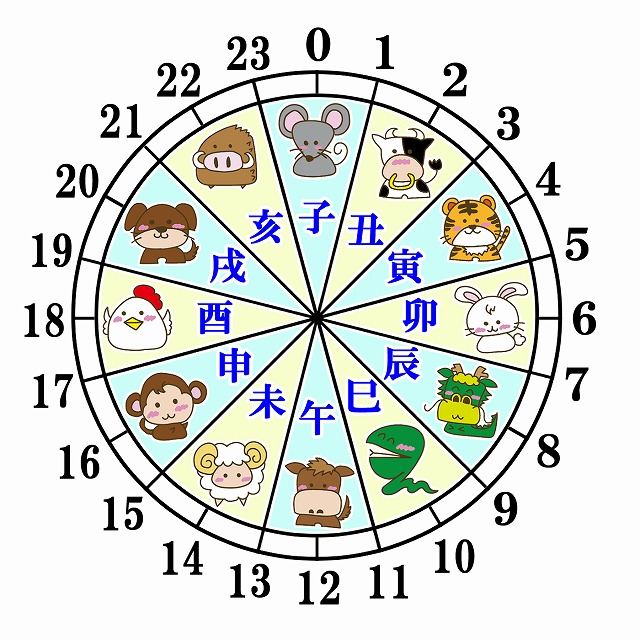 十二支→時間(夜中の11時から午前1時・子の刻)方位(子が北)
