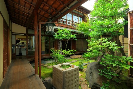 自然の美しさを愛でるとともに、京都の暑さをしのぐという庭園設計に基づいたちいさな流れ。
